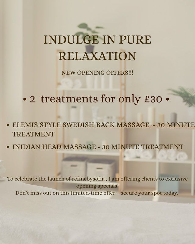 At Refine by Sofia, each massage is more than a treatment — it’s a tailored experience designed to restore balance, ease tension, and leave your body and mind in perfect harmony. Whether you’re craving the soothing flow of a Relaxing Wellbeing Massage, the deeper release of a Deep Tissue Massage, or the full-body rejuvenation of a Swedish Massage, every session is customized to meet your needs. Melt away stress, relieve muscle tension, and drift into total relaxation with warm oils, expert techniques, and a calming atmosphere designed for pure indulgence.